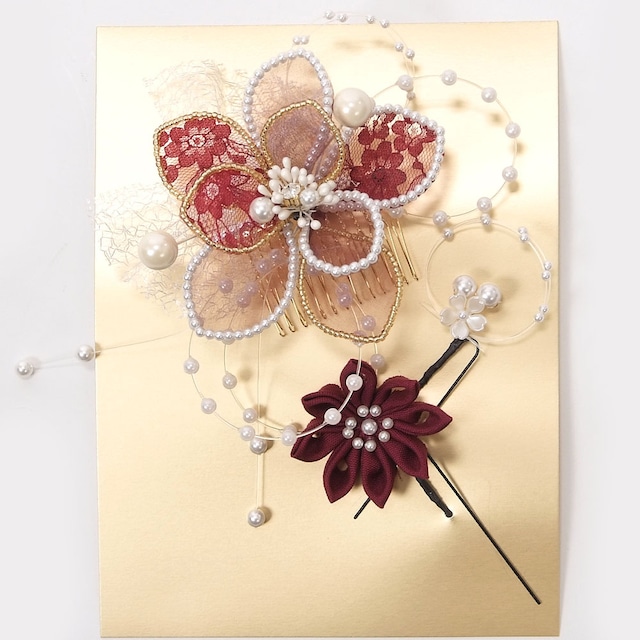 【きもの山喜】髪飾り 振袖 成人式 袴 3個セット Uピン シャルマン 花 レース 可愛い おしゃれ 日本製 ワイン