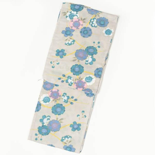 浴衣 3点セット 大人女性用の浴衣に兵児帯、下駄をセットにしました。 花の柄が素敵なデザインの浴衣です。 紅梅織、綿素材の生地になります。 天然繊維で吸湿性、通気性に優れ、浴衣にぴったりの生地ですので、さらりと着られて涼しいですよ。 ゆかたに兵児帯をセットにしました。 シワ加工でボリューム感が楽しめ、ラメ入りの落ち着きのあるダスティカラーでおしゃれです。 胴に2回廻してリボン結びにするだけで簡単に結べます。 下駄は、鼻緒が広めで履きやすい物をご用意しました。 ※下駄の色や柄はおまかせになります。 ※生地の取り方により柄の出方が異なります。 【お色目】 浴衣地色:オフホワイト系 帯:水色系 ※最善の色再現をしていますが、ご利用の環境でお色目が多少異なる場合がございます、ご了承下さい。 【品質】 浴衣: 綿 100% 帯:ポリエステル 100% 下駄:台 桐 中国製 【サイズ】 「浴衣」 身丈:約163cm 袖丈:約49cm 裄丈:約67cm 適応身長 155cm〜165cm位 「兵児帯」長さ:約4m 巾:約40cm