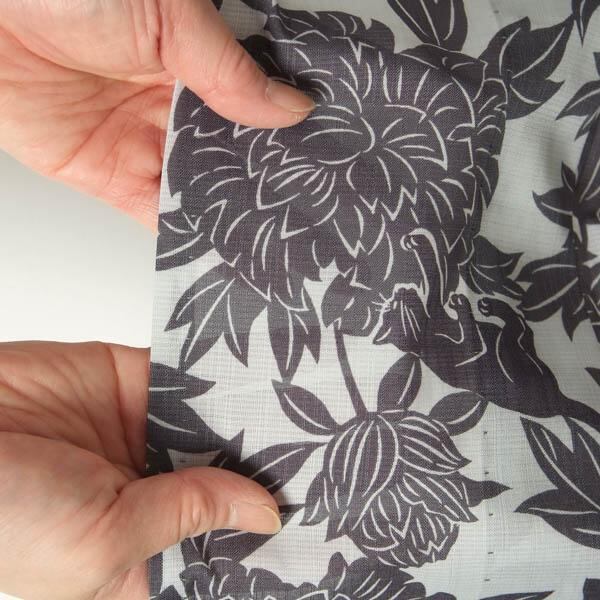 淡いグレーの地色に猫と牡丹の花模様が全体に描かれたデザインになっています。
