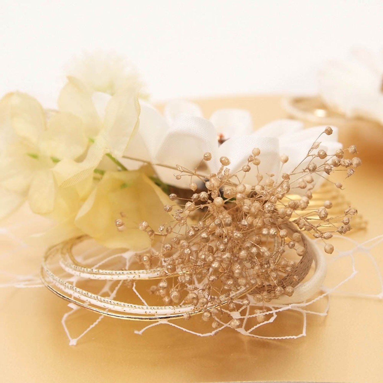 つまみ細工の花、水引、ドライフラワーなどの組み合わせがおしゃれなデザインです。
