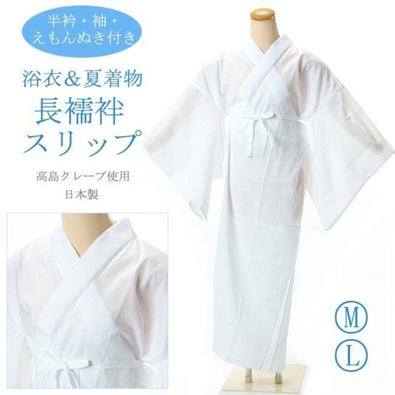 【きもの山喜】長襦袢スリップ 高島クレープ 綿100% 浴衣インナー 浴衣スリップ 半衿付 袖付き えもんぬき付き 夏着物スリップ 夏ワンピース肌着 日本製