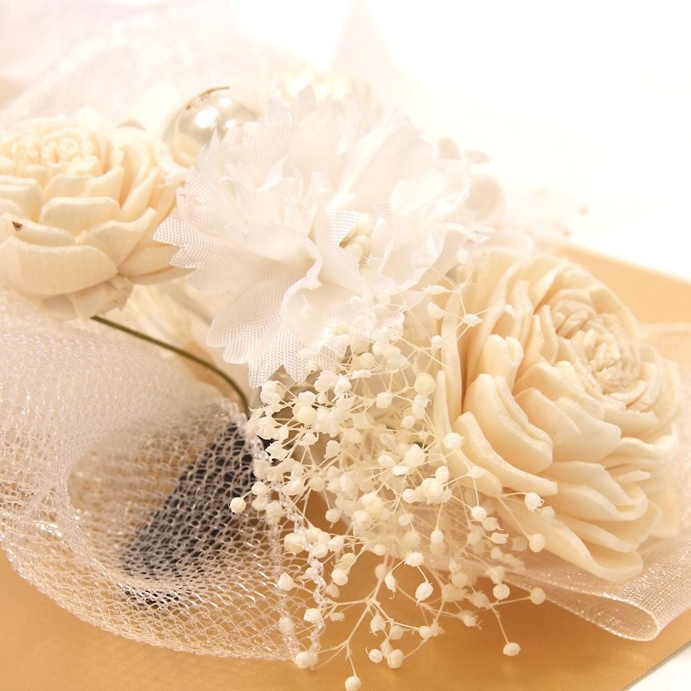 チュールレース、リボン、プリザーブドフラワーなどの組み合わせがおしゃれなデザインです。