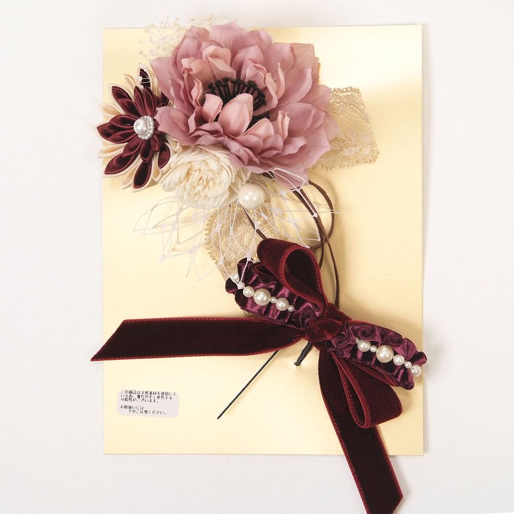 【きもの山喜】髪飾り 振袖 成人式 袴 2個セット シャルマン つまみ細工 ベルベットリボン プリザーブドフラワー 可愛い おしゃれ 日本製 ワイン