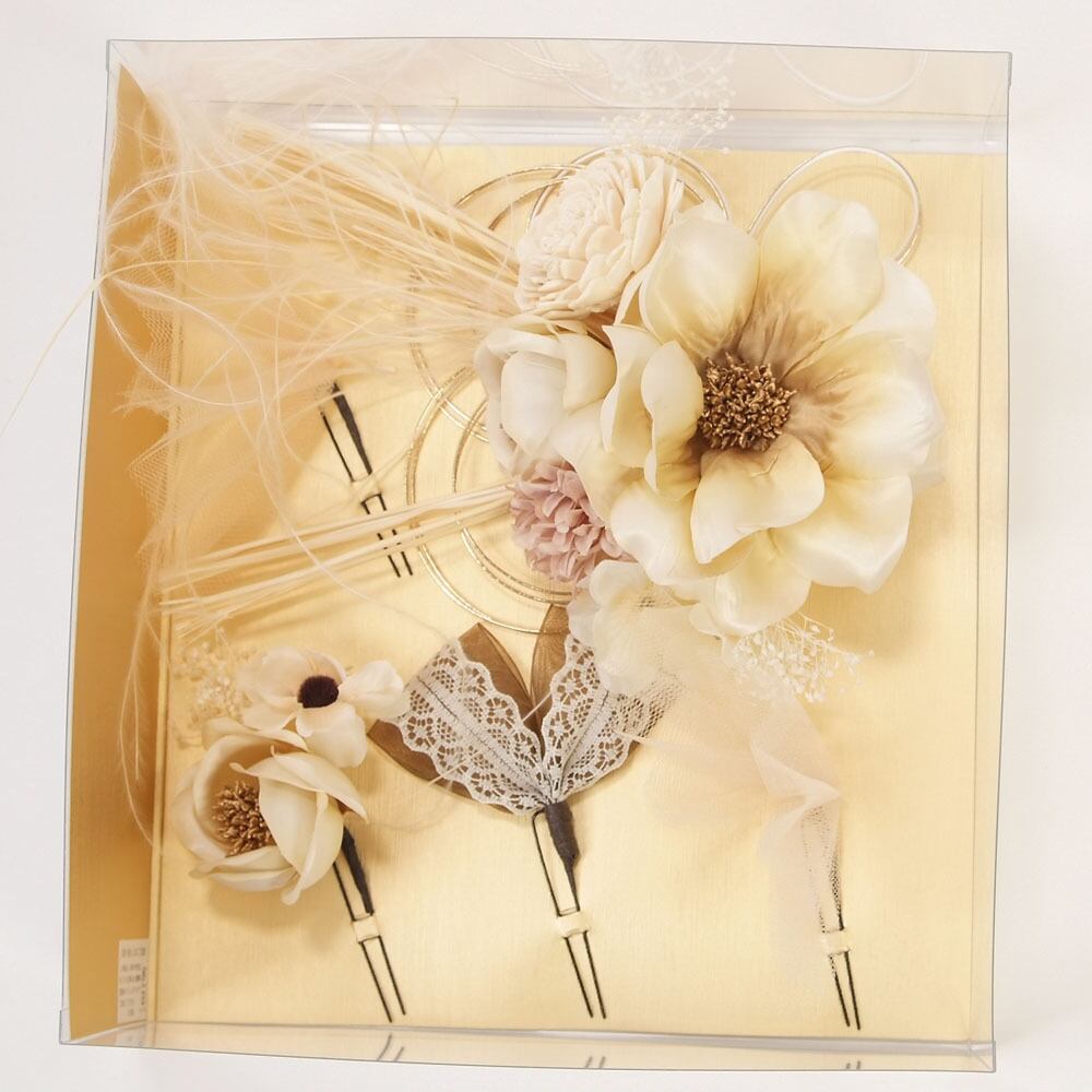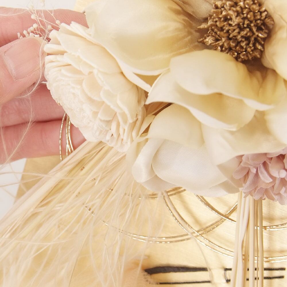 ナチュラルカラーの花モチーフと天然素材、水引の組み合わせがおしゃれです。