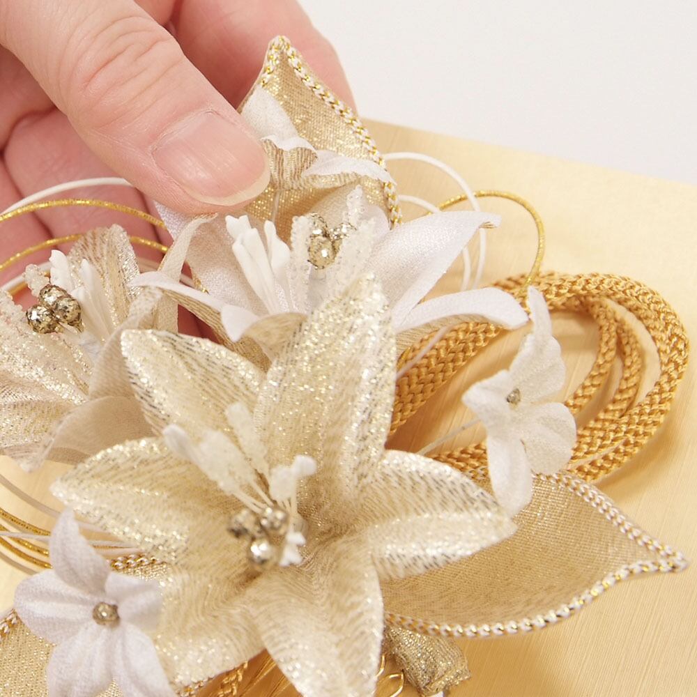 花モチーフと、水引、組紐の組み合わせがおしゃれです。