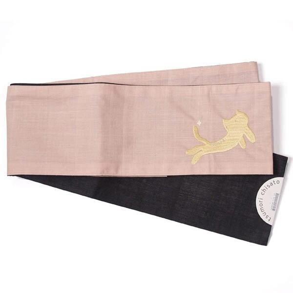 【きもの山喜】半幅帯 tsumori chisato 麻 浴衣帯 細帯 リバーシブル 両面 夏帯 猫 ピンク×黒