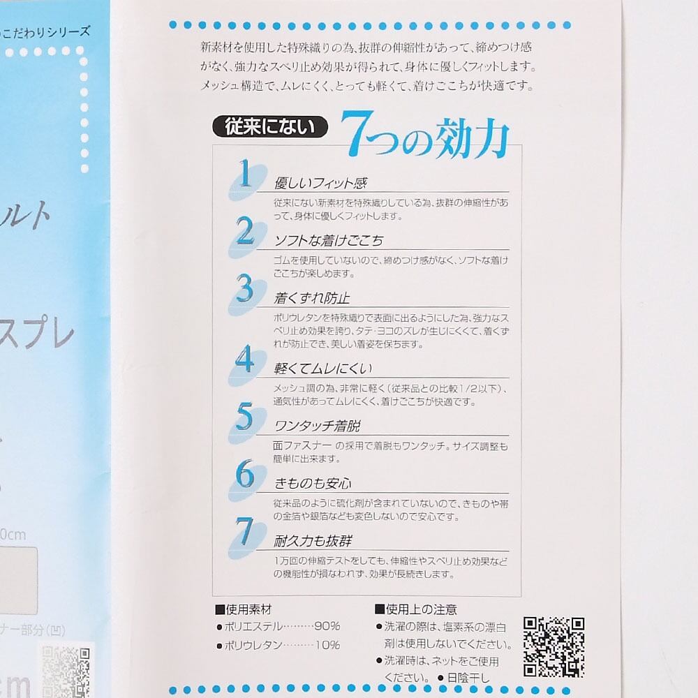 ポリウレタンを特殊織りで表面に出る様にした為、強力なスベリ止め効果を誇り、タテ・ヨコのズレが生じにくく、着崩れが防止でき、美しい着姿を保ちます。