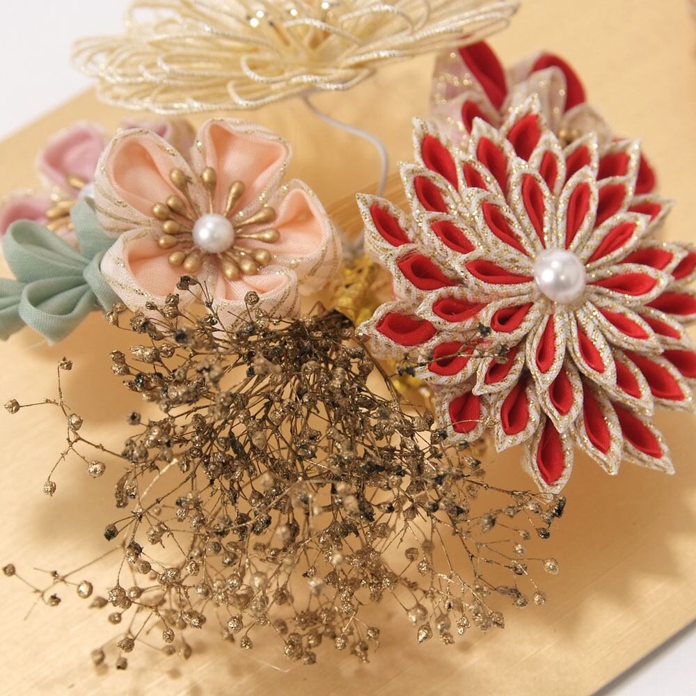 つまみ細工の花と、水引、ドライフラワーの組み合わせがおしゃれです。