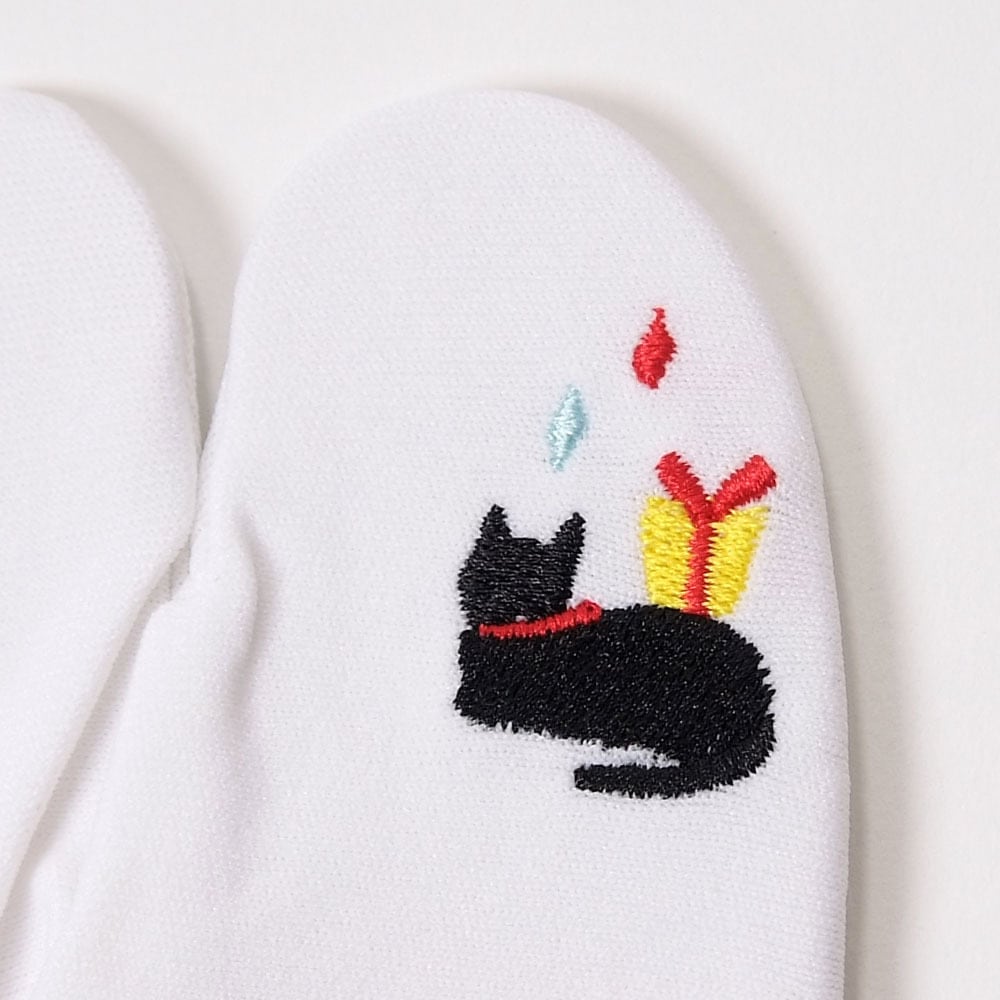 猫の刺しゅうが、左右の指の外側に施されています。