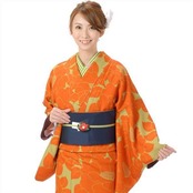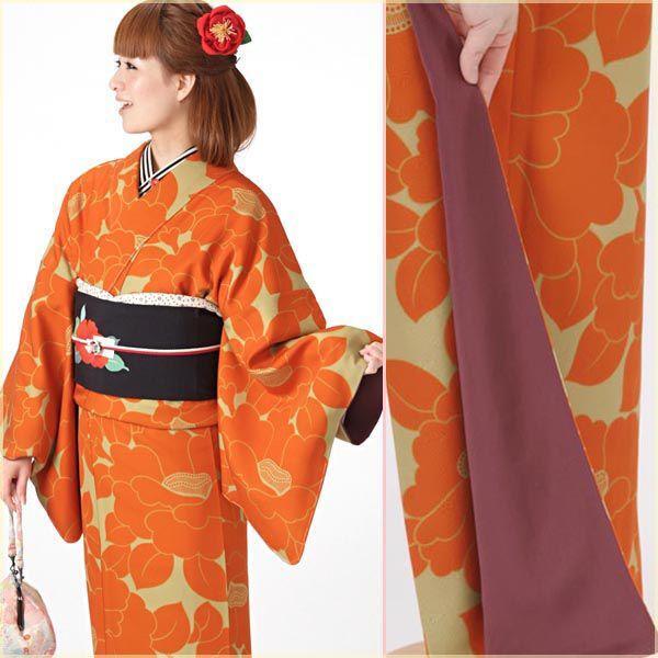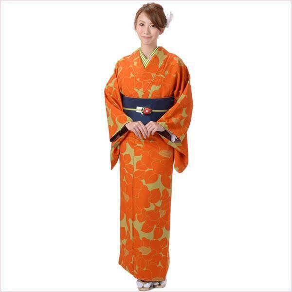 グリーン地にオレンジ系の大きな椿の柄のきもの。