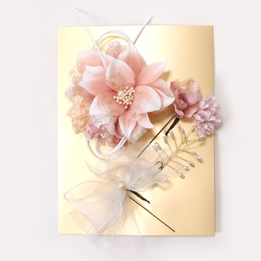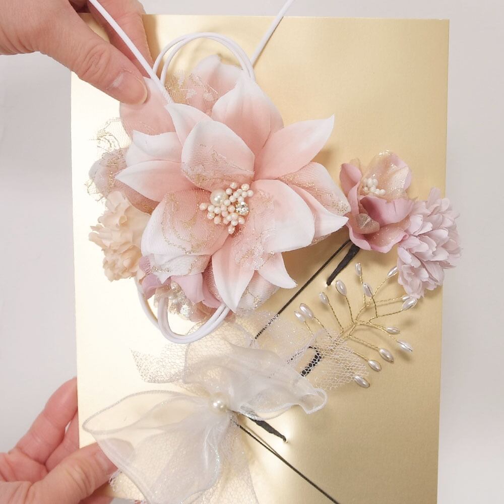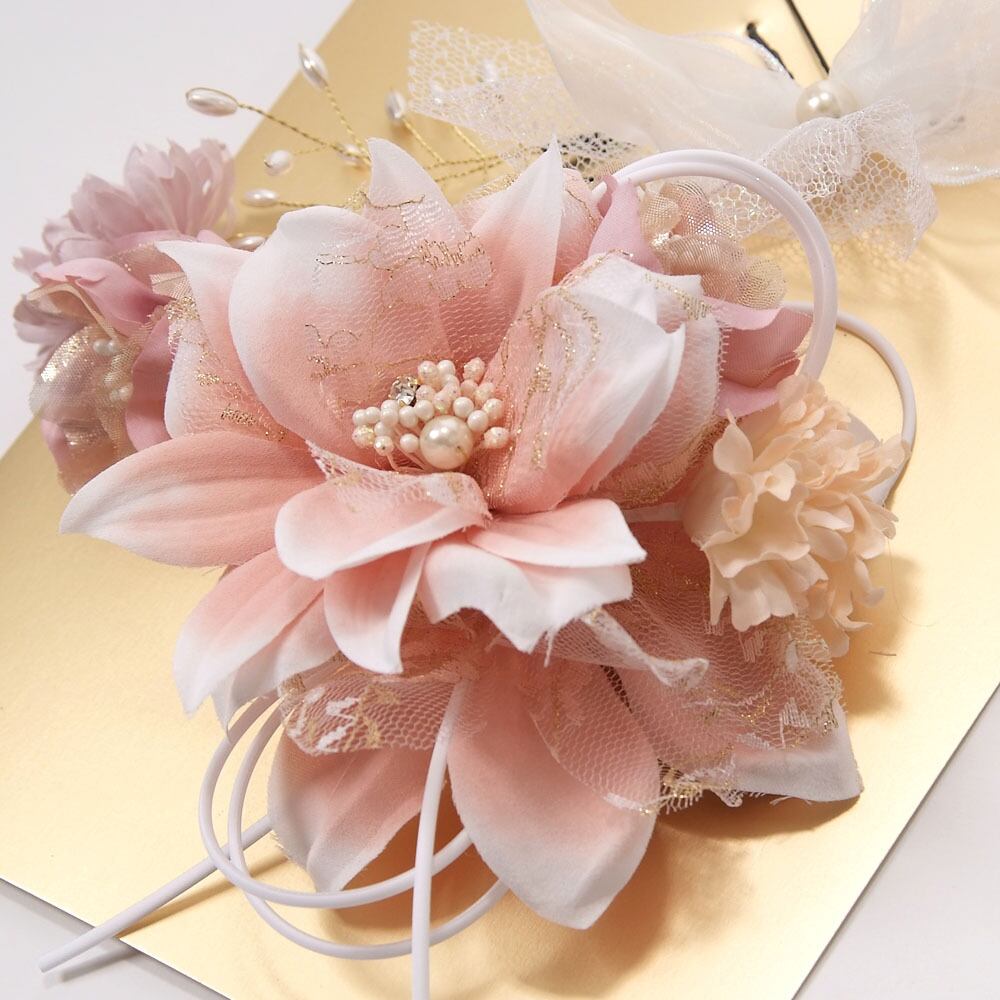 レース使いがエレガントな花モチーフや、リボンなどのデザインがおしゃれな髪飾りのセットです。