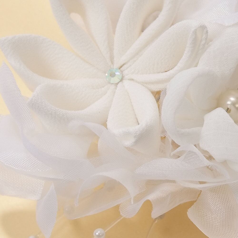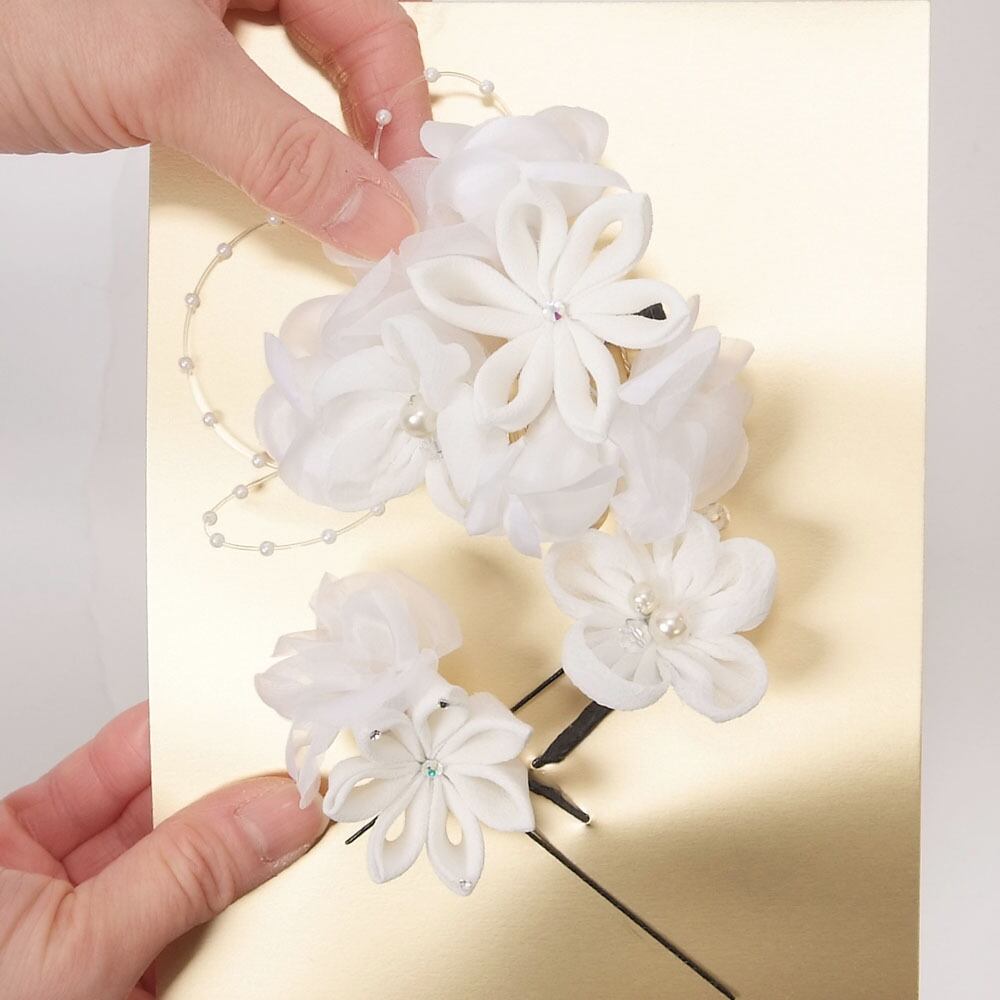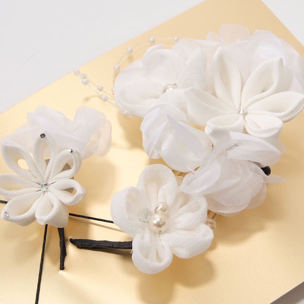 つまみ細工とシフォンの花モチーフや、パール使いがおしゃれな髪飾りのセットです。