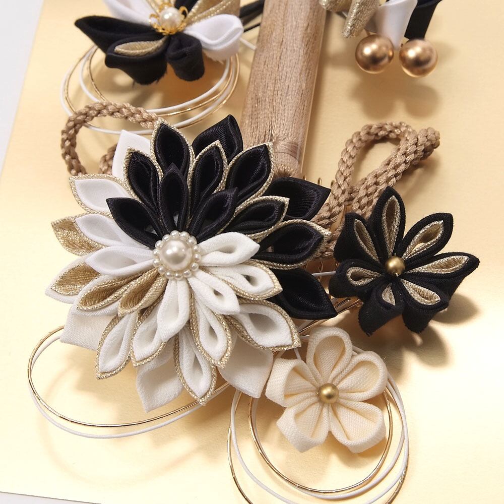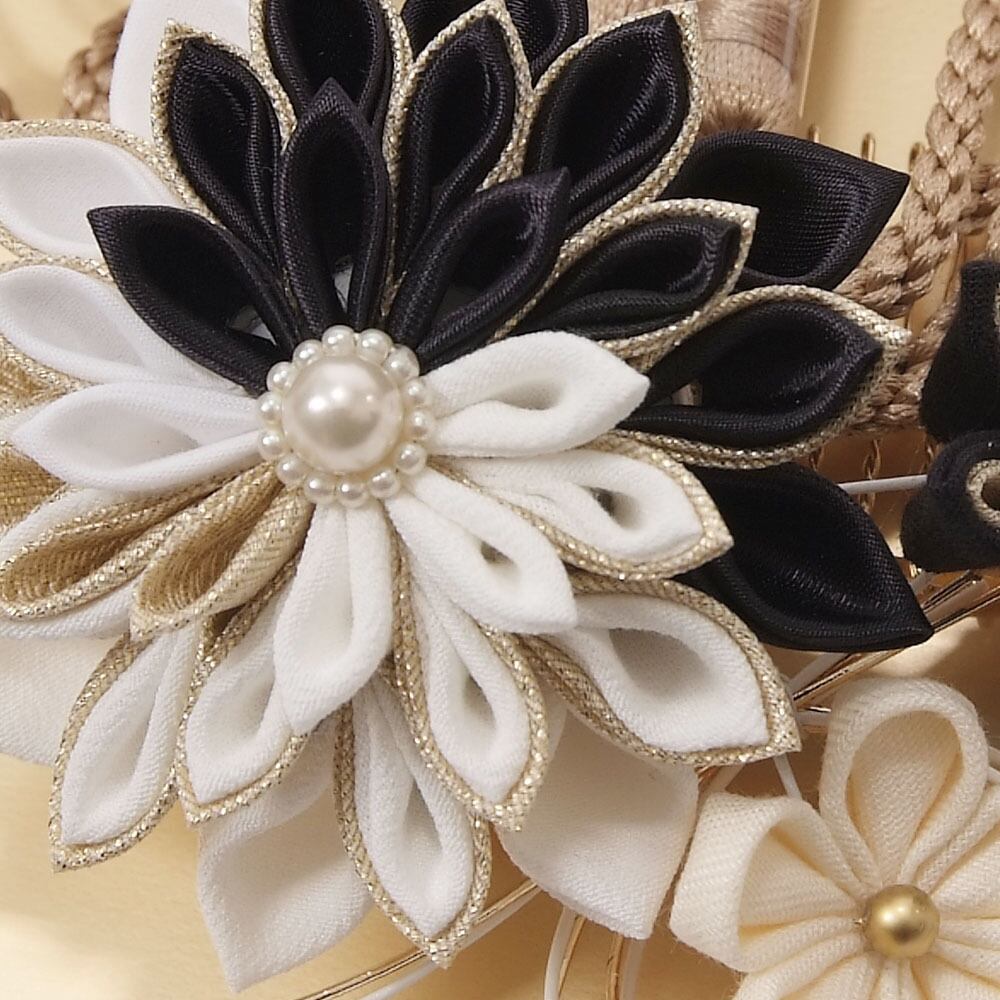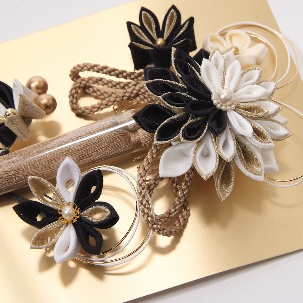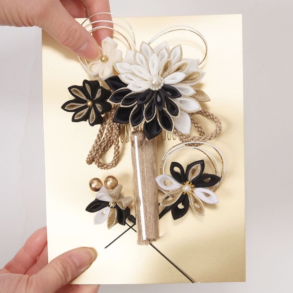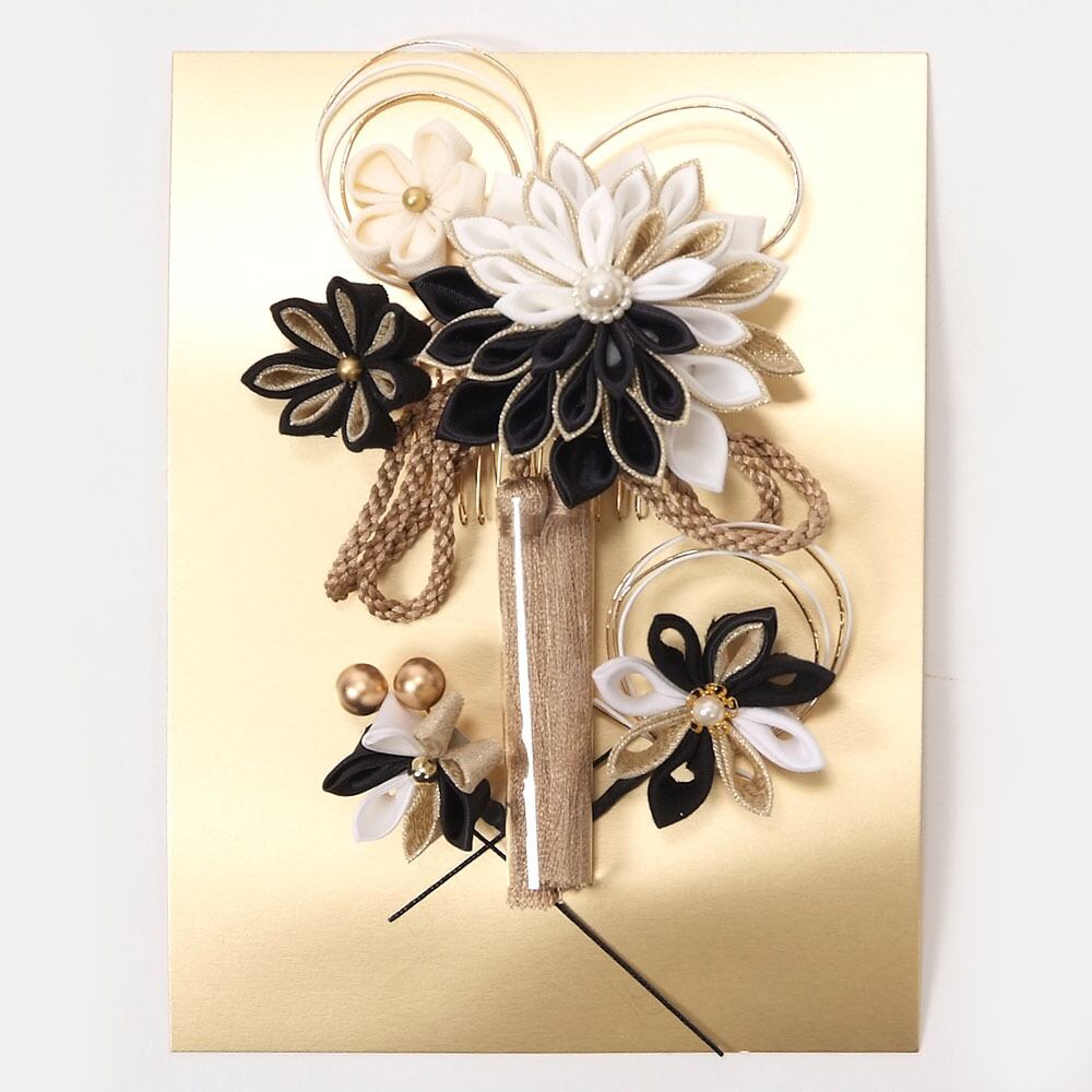 【きもの山喜】髪飾り 振袖 成人式 袴 3個セット Uピン シャルマン 花 つまみ細工 ふさ 可愛い おしゃれ 日本製 黒