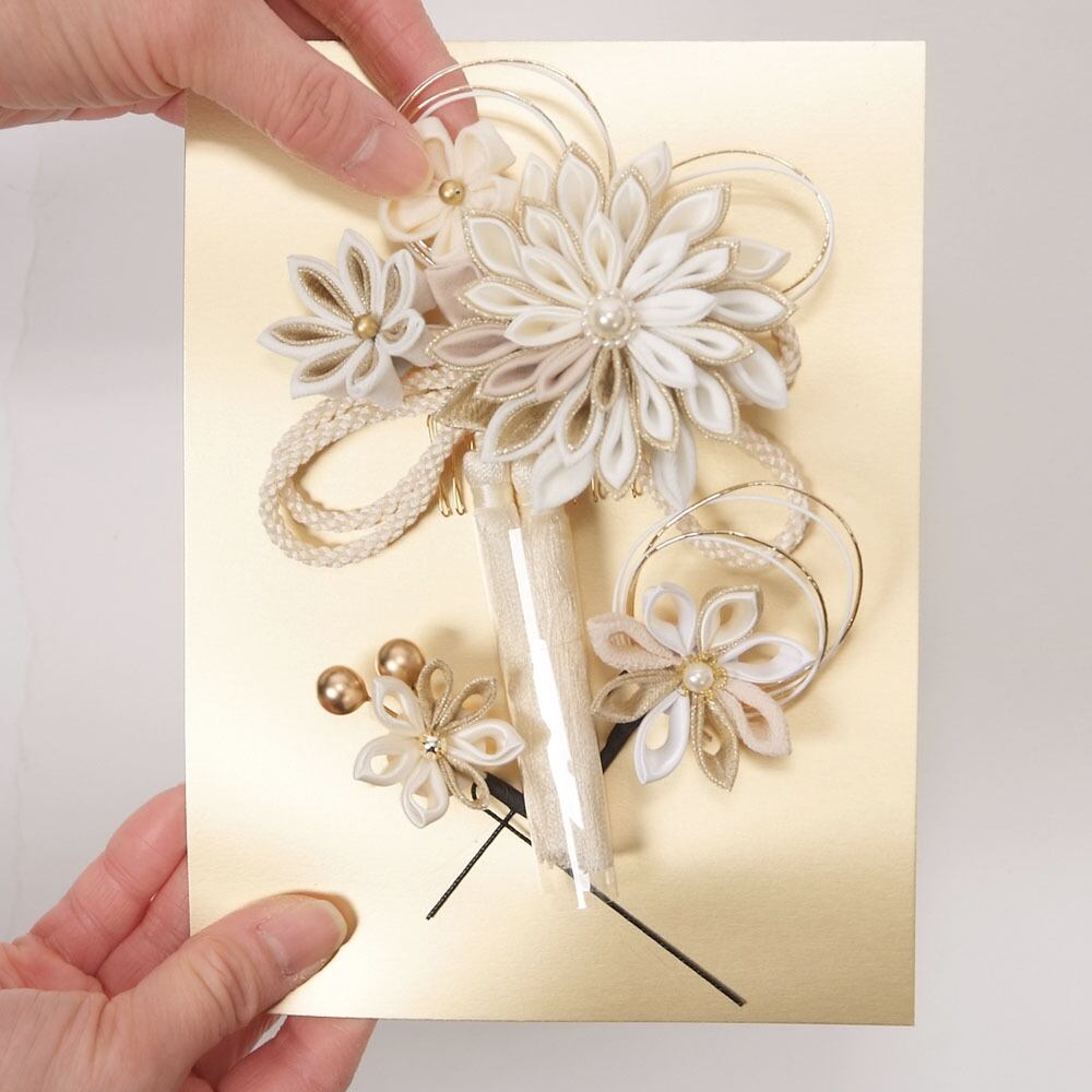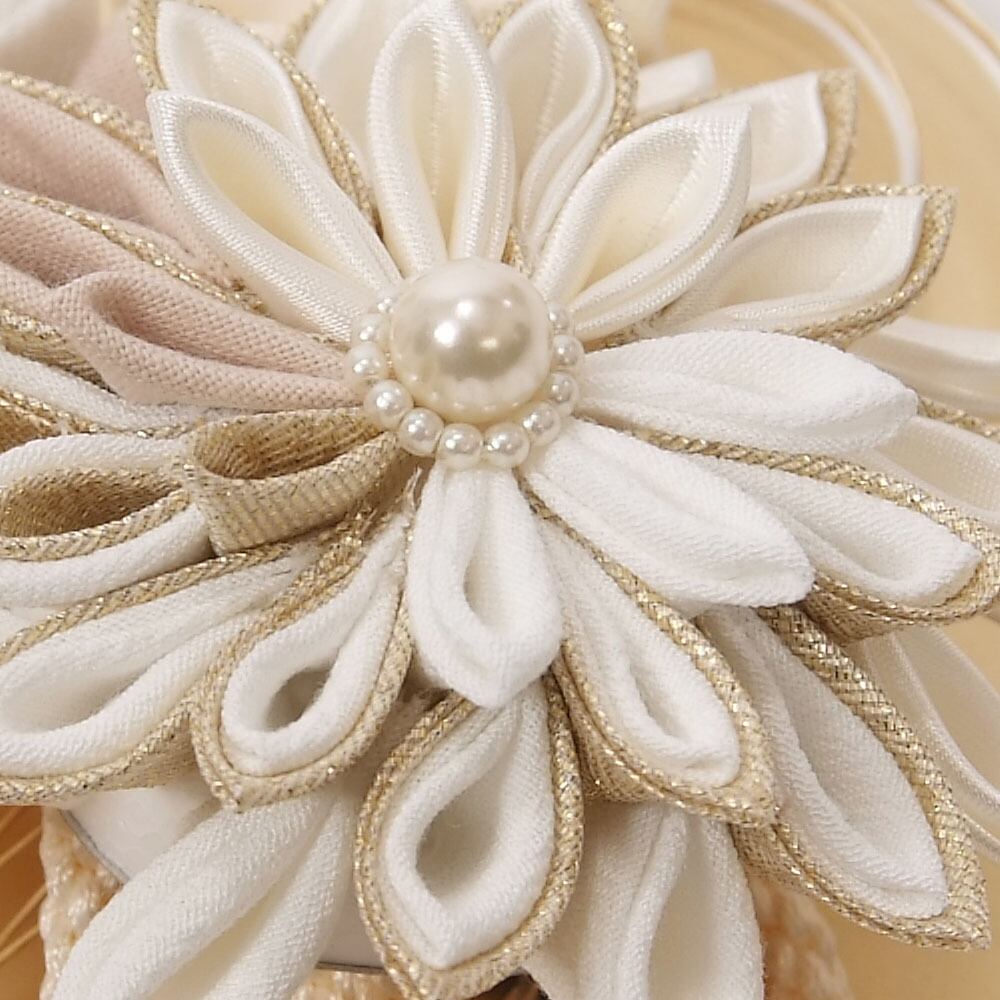 つまみ細工の花は、ゴールドを使用した華やかで豪華なつくりになっています。