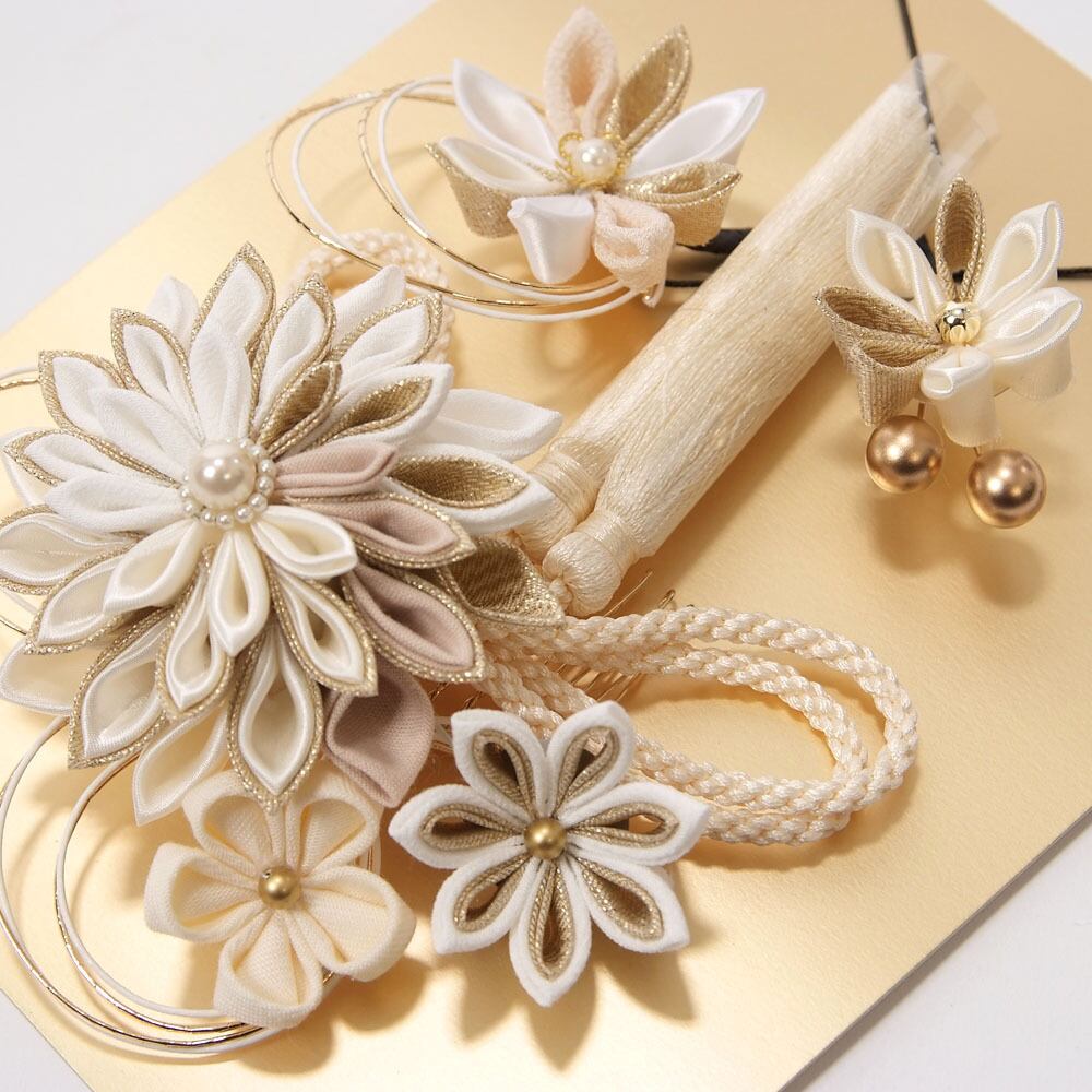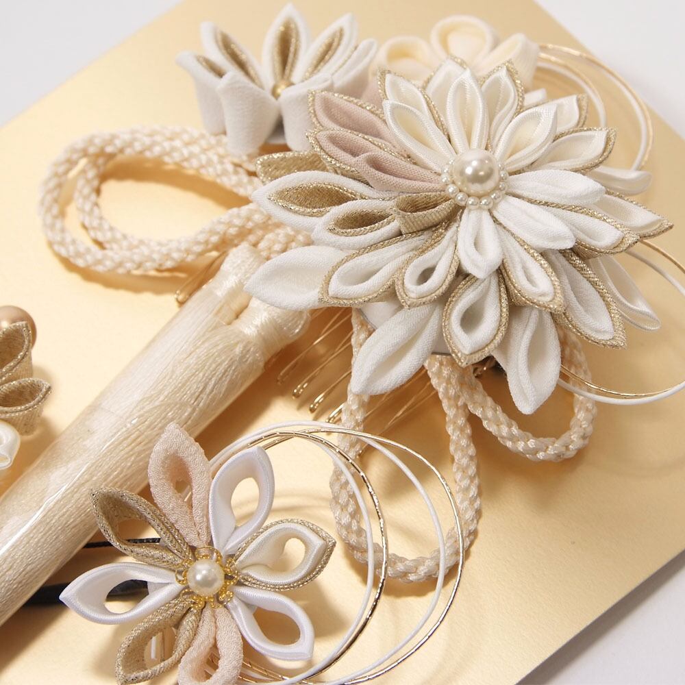 【きもの山喜】髪飾り 振袖 成人式 袴 3個セット Uピン シャルマン 花 つまみ細工 ふさ 可愛い おしゃれ 日本製 白