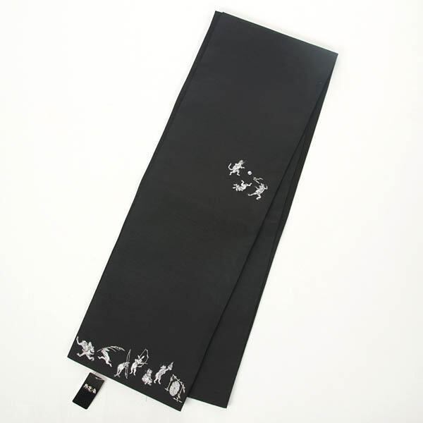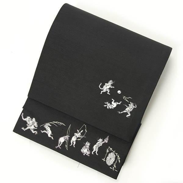 【きもの山喜】名古屋帯 京袋帯 撫松庵 仕立て上がり品 鳥獣戯画 ポリエステル 一重太鼓袋帯 日本製 カジュアル 黒