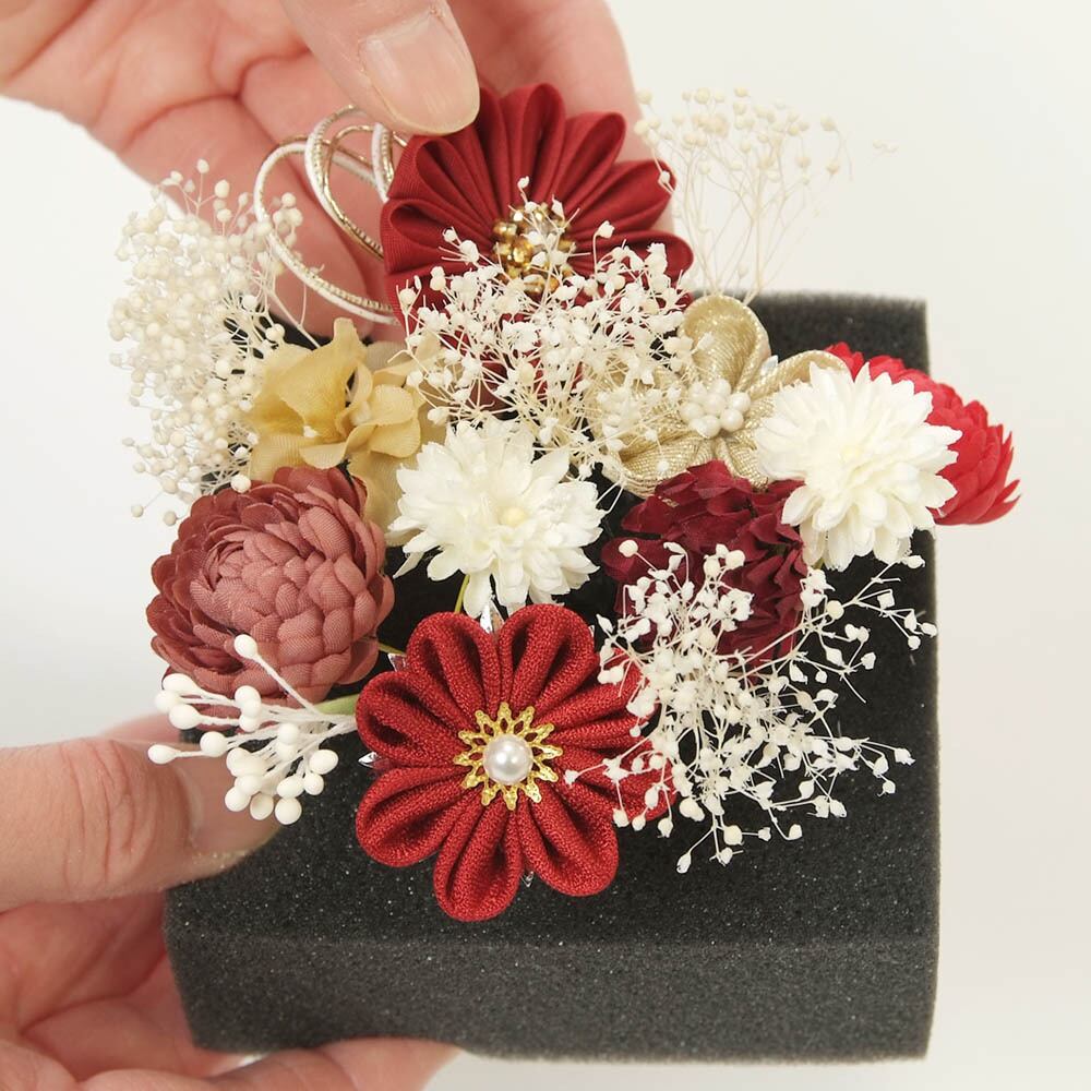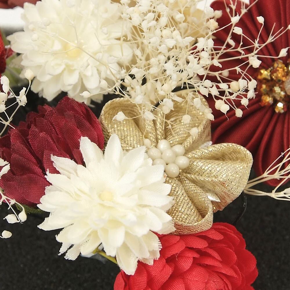 つまみ細工の花とマムの花が可愛いデザインになっています。