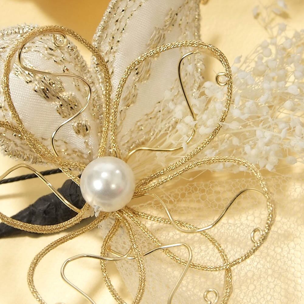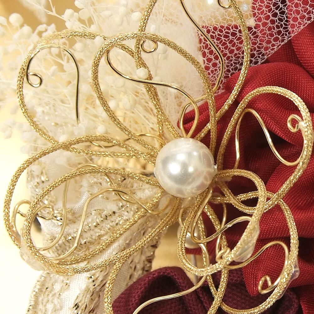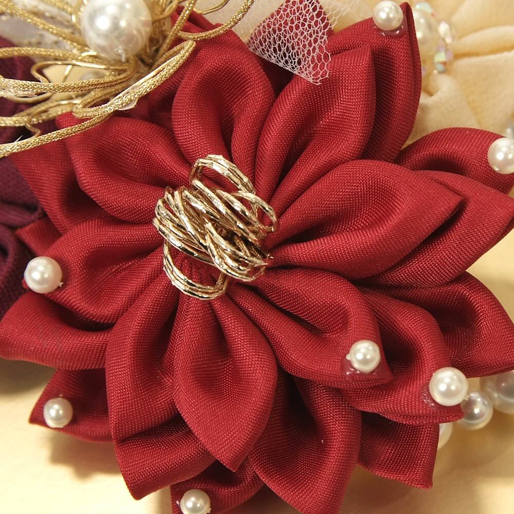 つまみ細工の花、刺繍、パールの飾り、ドライフラワーなどの組み合わせがおしゃれなデザインです。