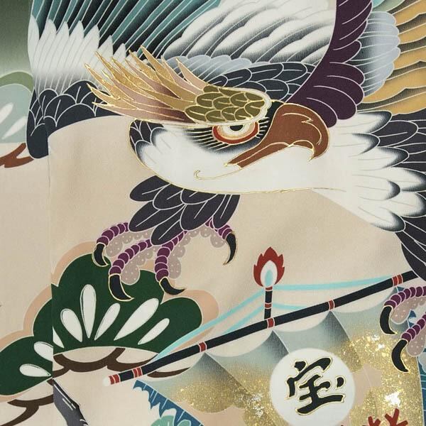 鷹、宝船、松や宝尽くしの模様が施されています。