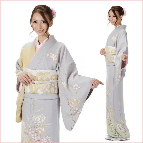 グレー地にぼかし加工、花の模様が素敵なお着物です。