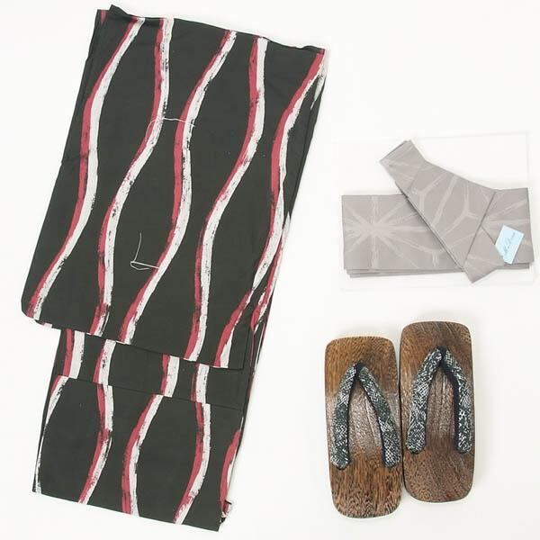 浴衣にワンタッチの角帯、下駄の3点セットになります。