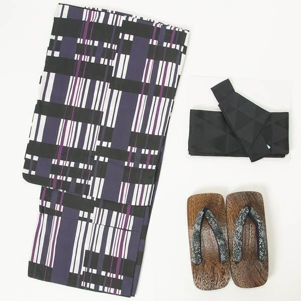 浴衣にワンタッチの角帯、下駄の3点セットになります。