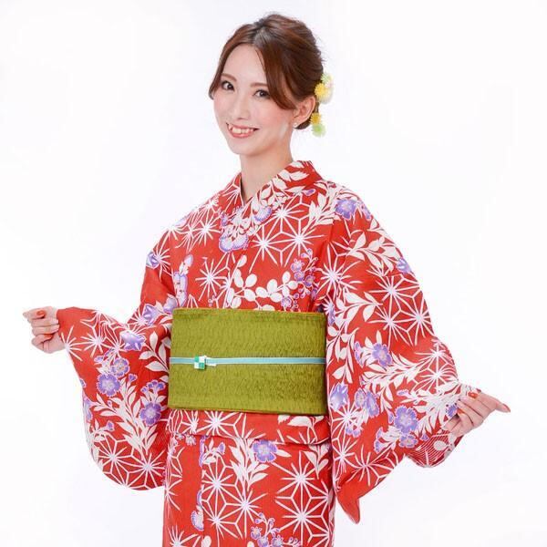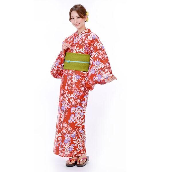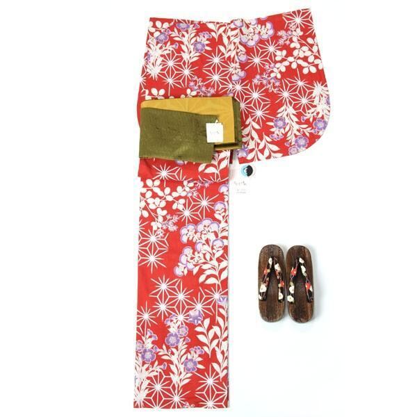【きもの山喜】浴衣 レディース そしてゆめ浴衣+そしてゆめ半巾帯+下駄 3点セット 赤 麻の葉