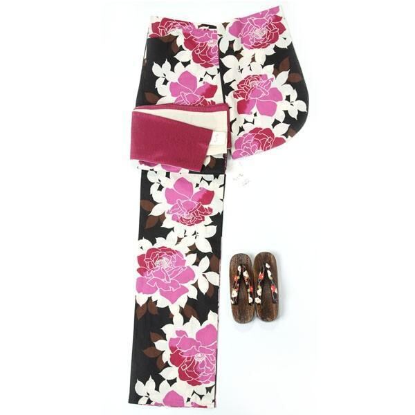 サイズ 浴衣:身丈165cm 袖丈51cm 裄丈69cm 適応身長 155cm〜170cm位 半巾帯:長さ 約397cm 幅 約16.8cm 下駄:フリーサイズ