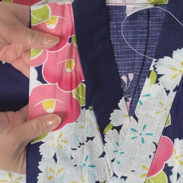 このゆかたは手縫いで縫い揚げがしてありますので、縫い直して頂きますと丈の調節ができます。ゆかたには腰紐が縫い付けてありますので、脇で通して前で結ぶだけの簡単装着です。