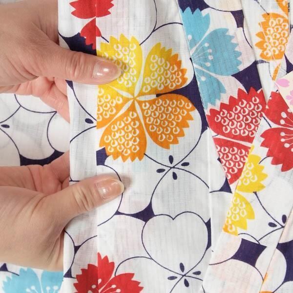 このゆかたは手縫いで縫い揚げがしてありますので、縫い直して頂きますと丈の調節ができます。ゆかたには腰紐が縫い付けてありますので、脇で通して前で結ぶだけの簡単装着です。
